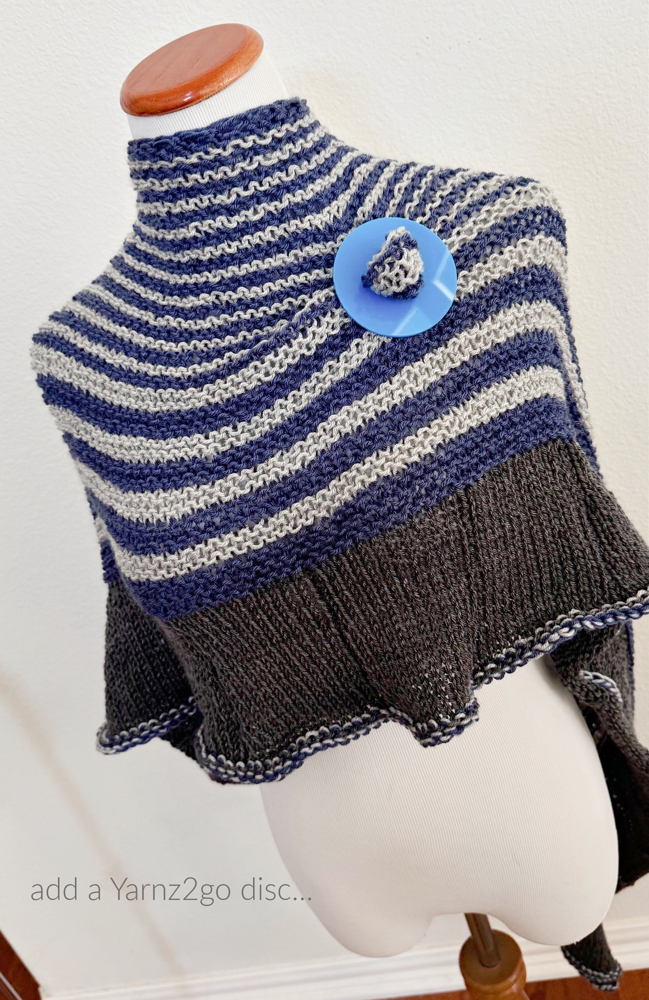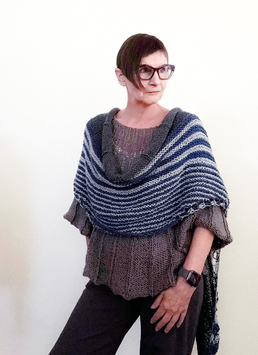 The crescent shape keeps growing from the top down, with small stripes, then larger ones and finally, the bottom border was inspired by the projects in my Idris collection (see them when you scroll down). The bottom edge is bound off with the first two colors from the striped section held together. The simple knit and purl stitches used with a couple of interesting ways to increase the size are effective and easy enough for an advanced beginner to create. Love, that....