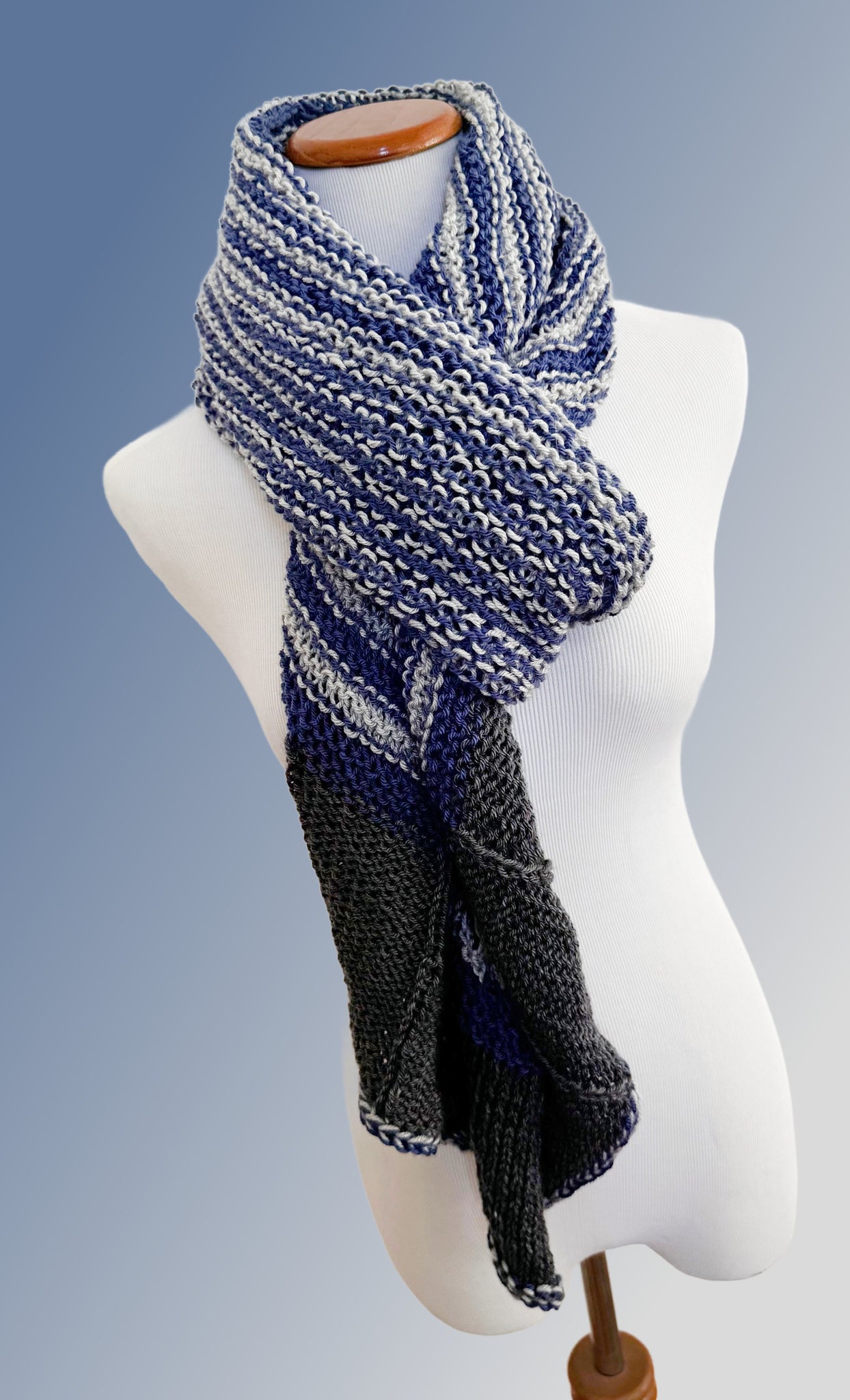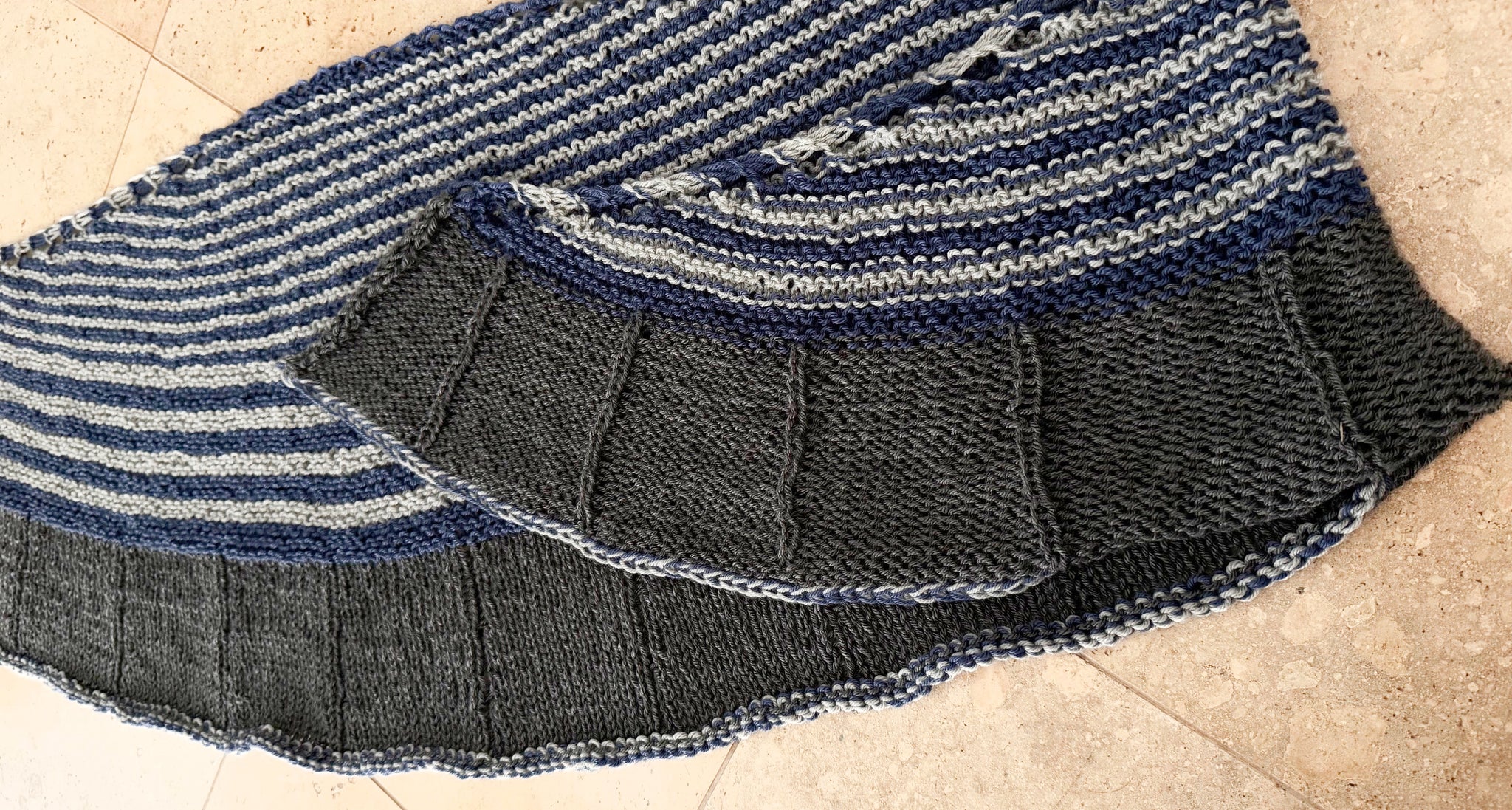 Techniques applied: Knitting and purling, increasing, color changes, binding off with two yarns held together, weaving in ends. Blocking is optional, my sample shown was actually not blocked.