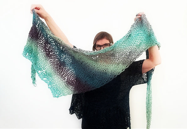 Garron is an asymmetrical triangular shawl that is bound to become one of your favorites. A simple cable motif runs diagonally and intermittently throughout, adding a wonderful showy accent. The shawl is reversible as well. Add a braid or tassel or both, why not, right?
