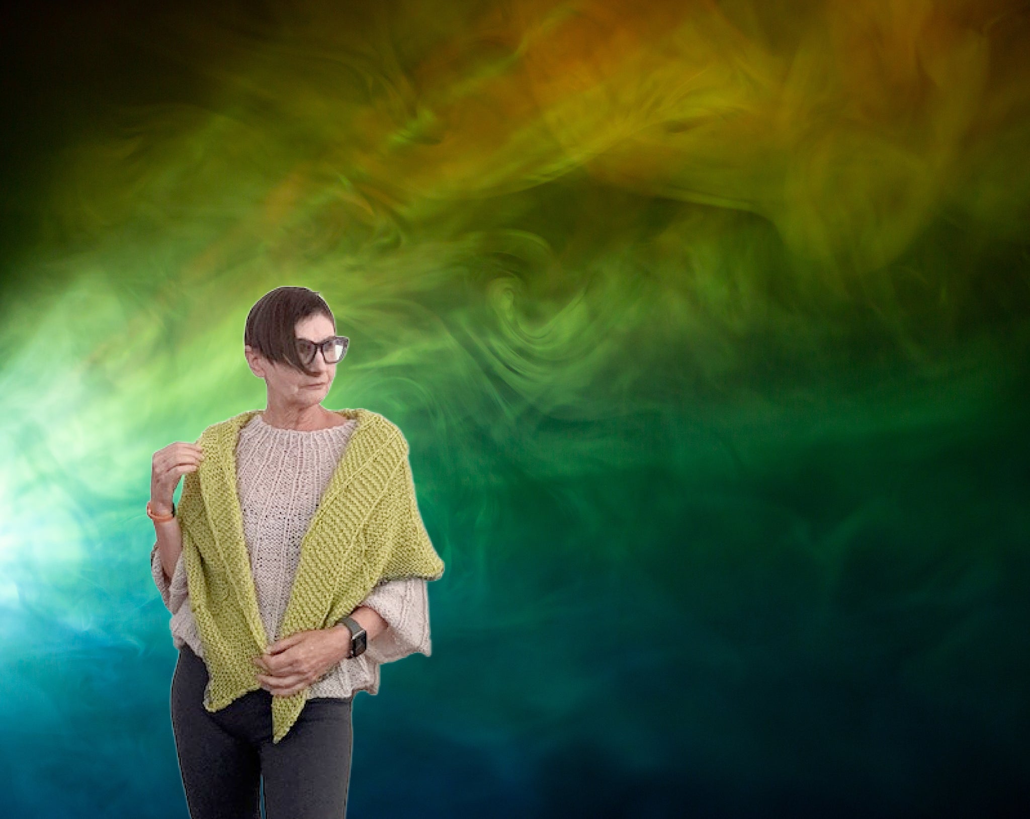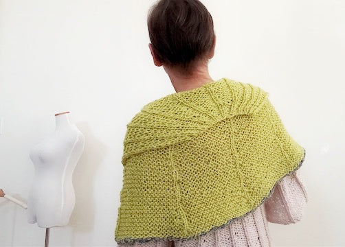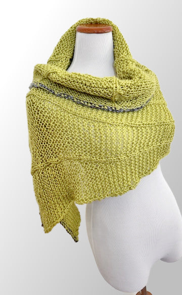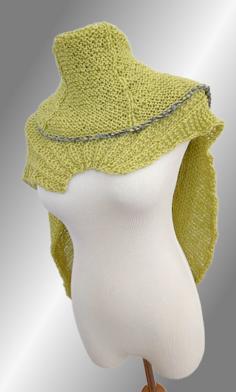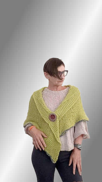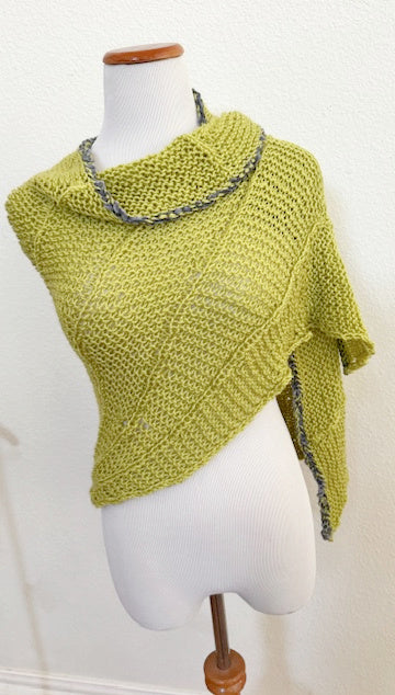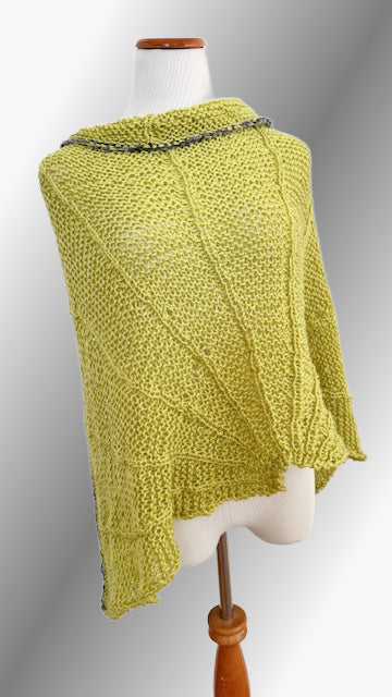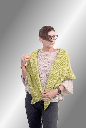 The new Idris shawl is knitted with the same stitch pattern as the matching Idris sweater, poncho and hat, only the shawl has an awesome bulky Chenille yarn added to the bottom border. And just how special is this Chartreuse color? Of course there are many other color wonderful combos to choose from, just look at the line up... Enjoy the fan like stitch pattern, it is pure fun to create and this shawl grows quickly.