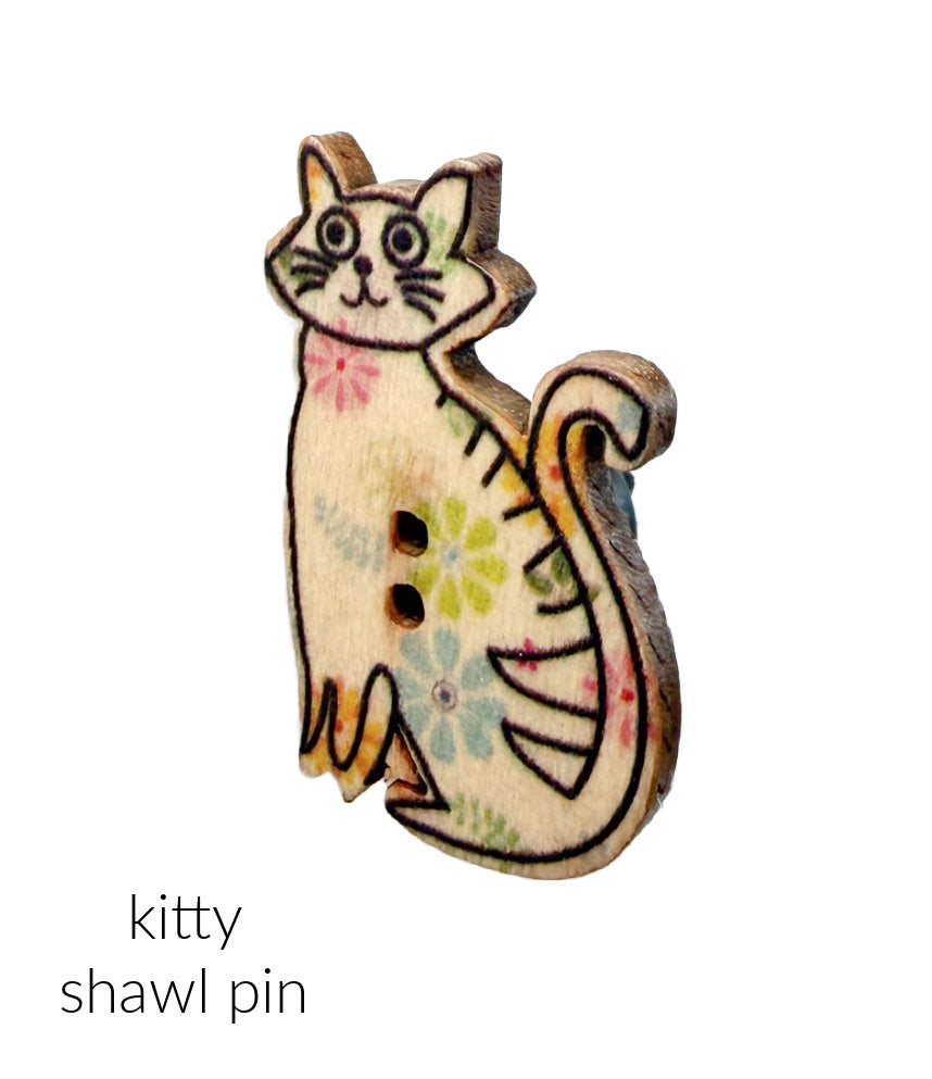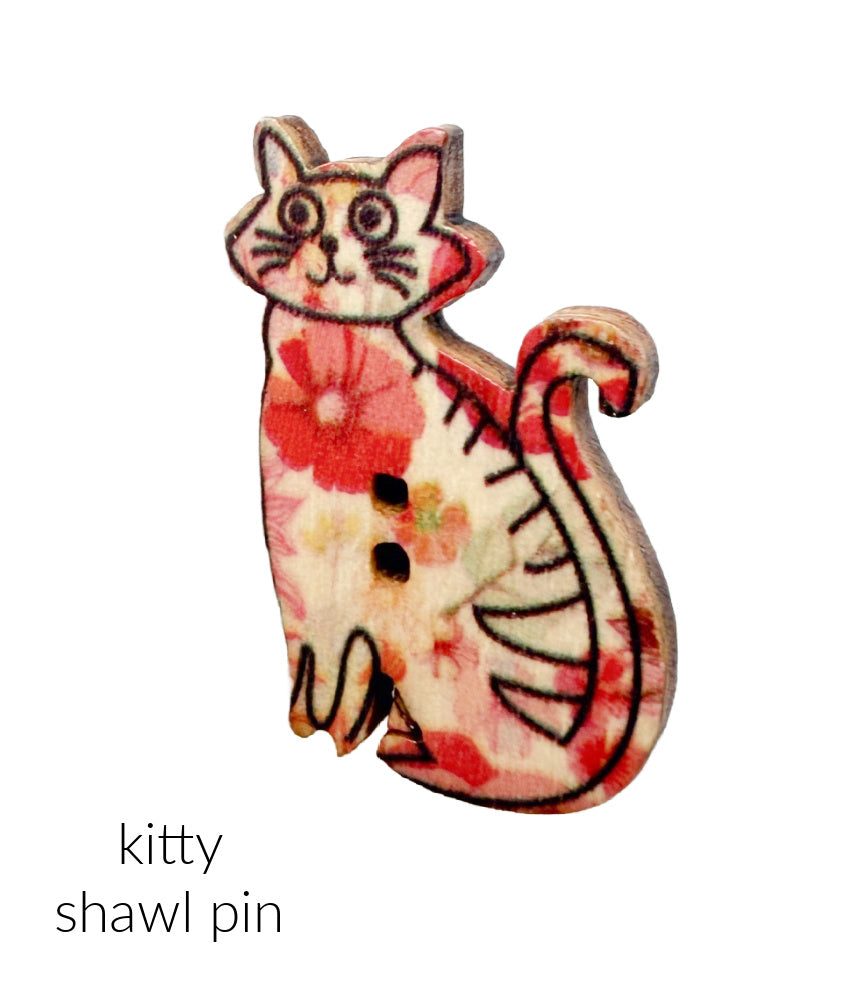 You'll love a little shawl pin featuring adorable kitties! These pins are colorful, super light weight and they hold your shawl in place beautifully. They also can be pinned on anything you can think off, like a backpack, a sweater, coat lapel, even your curtains. Think out of the box....