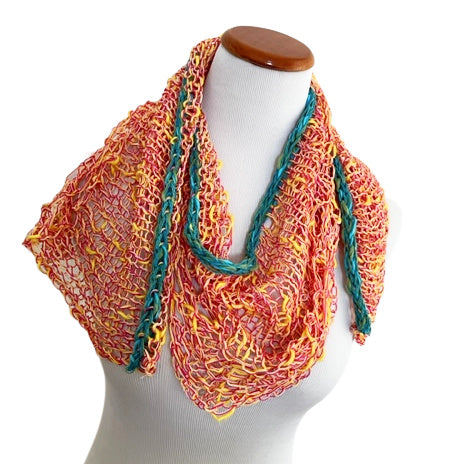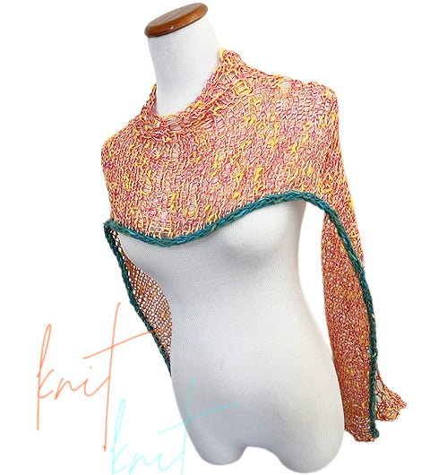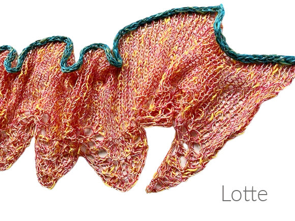 This shawl brings up memories of a very creative aunt of mine. She created/baked tortes like you would not believe. So I called this shawl Lotte in her honor, as I remember one of my faves, a yummy peach torte with a turquoise colored frosting. Child hood memories are the best aren't they?