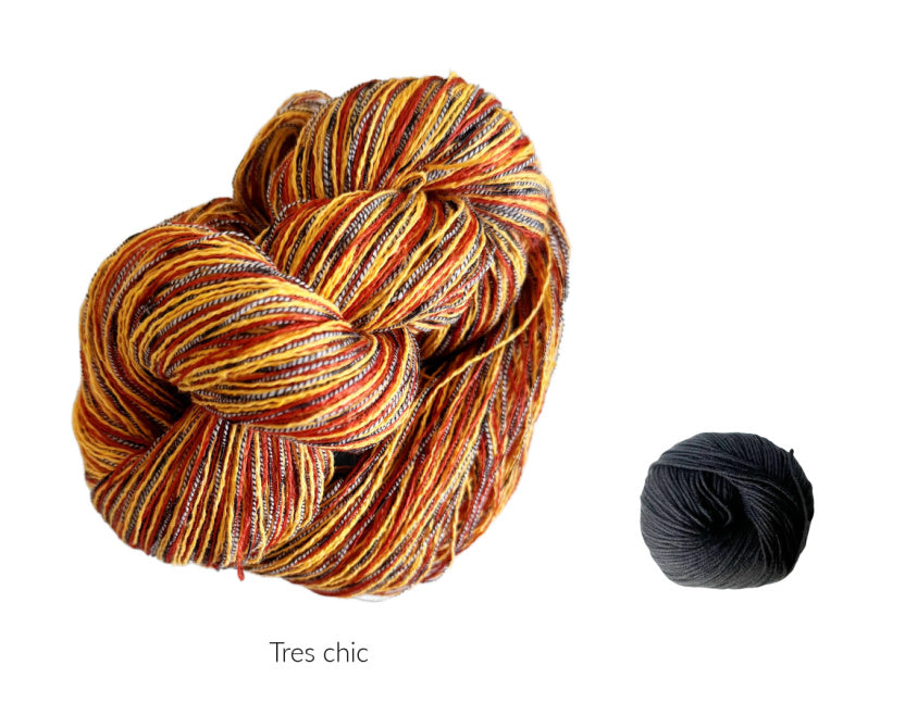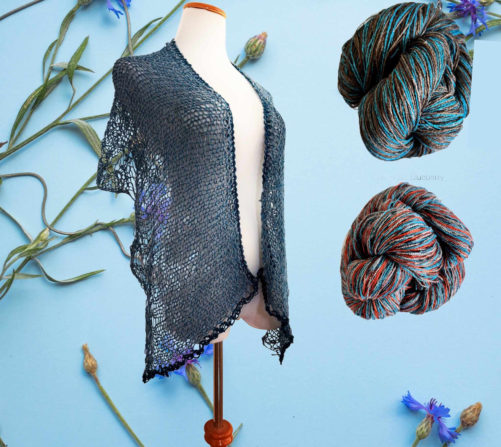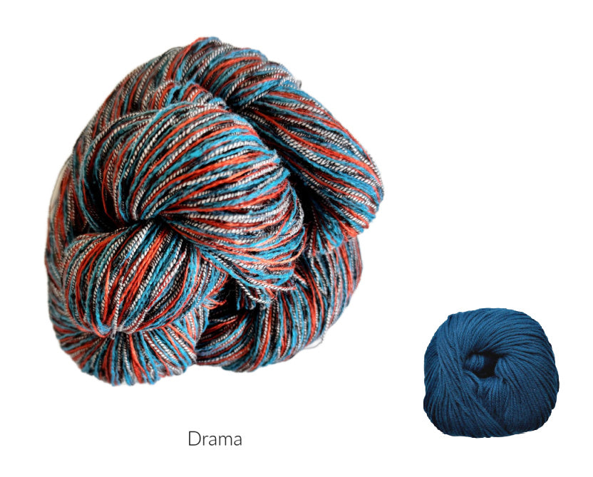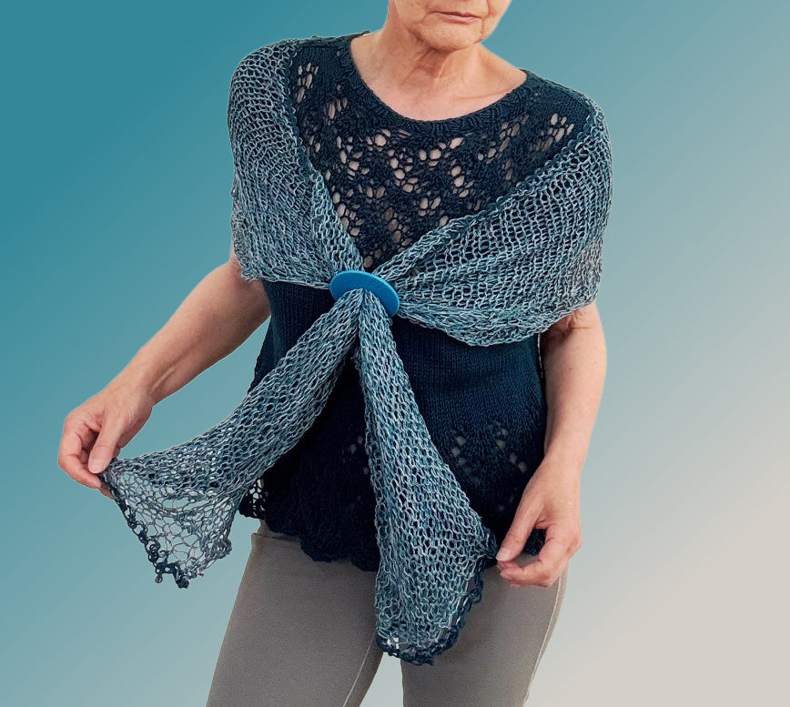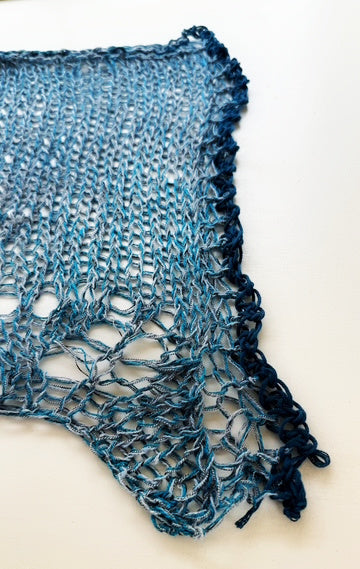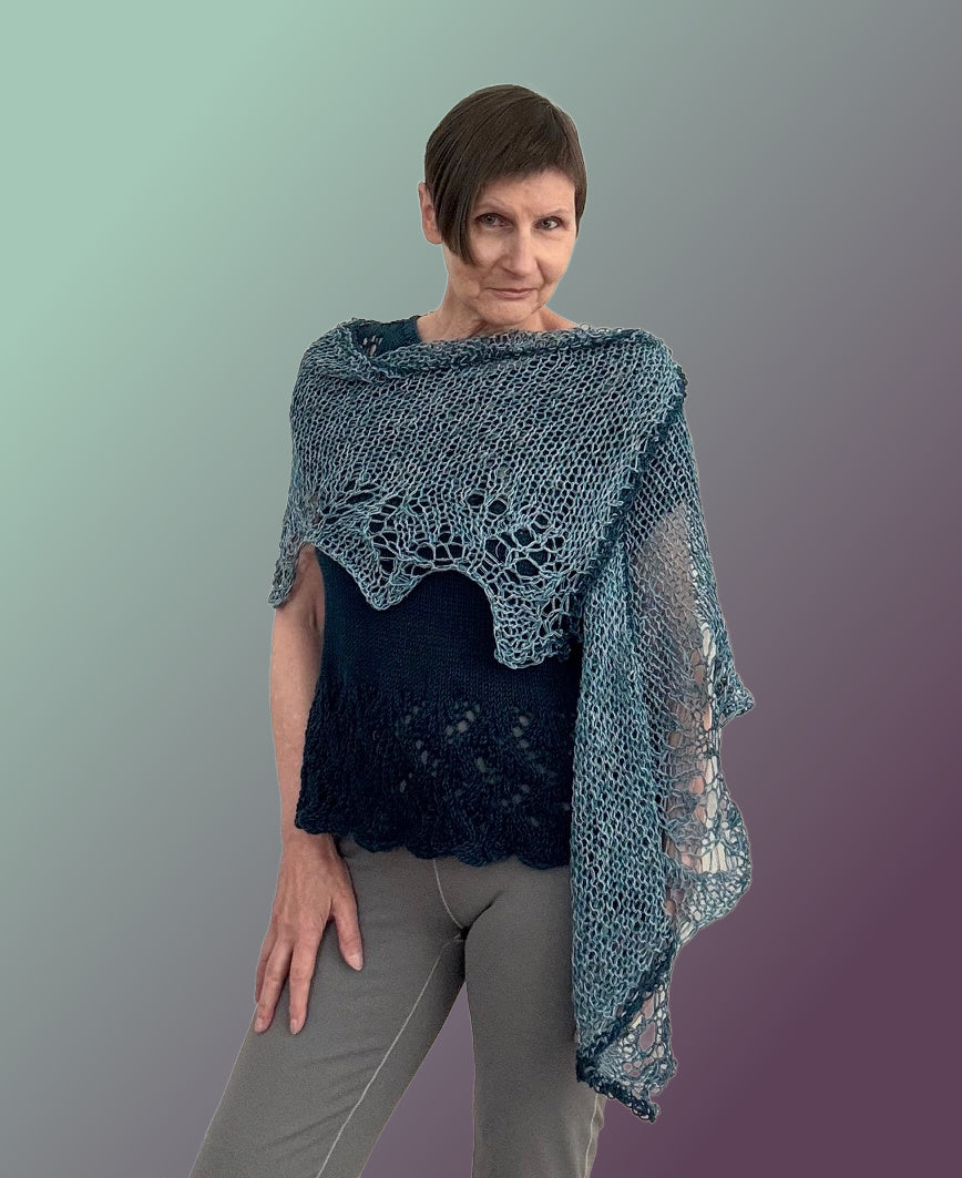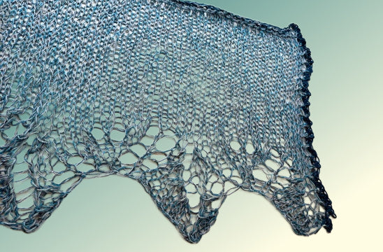 The new Lutz shawl is knitted with our Delicate skeins, which creates a beautiful fabric. They were just added to the shop again after a long absence. These skeins produce dramatic colors great drape in whatever you create with them.