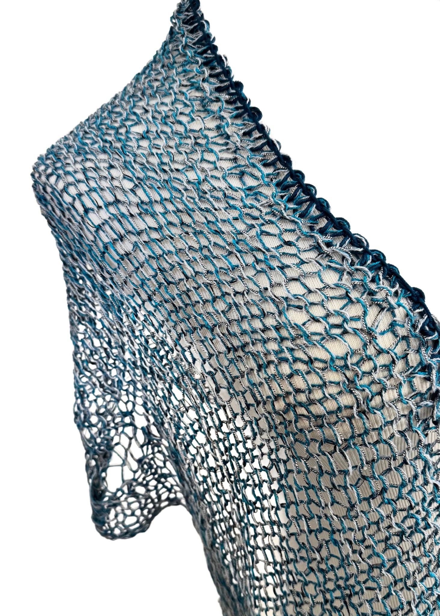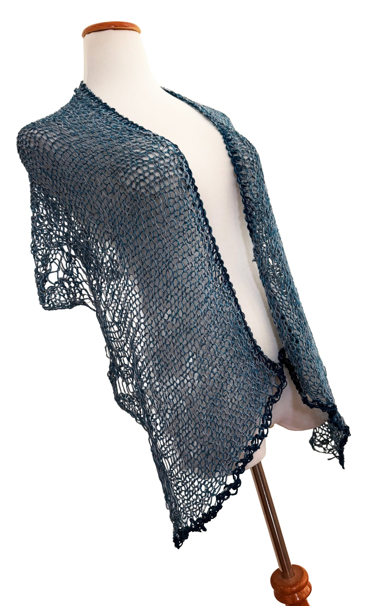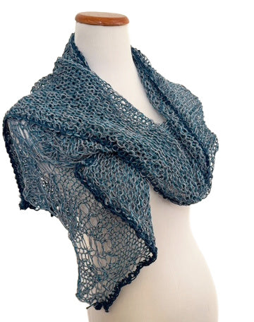 The blocked shawl measures 55" in length and 16.5" in height.