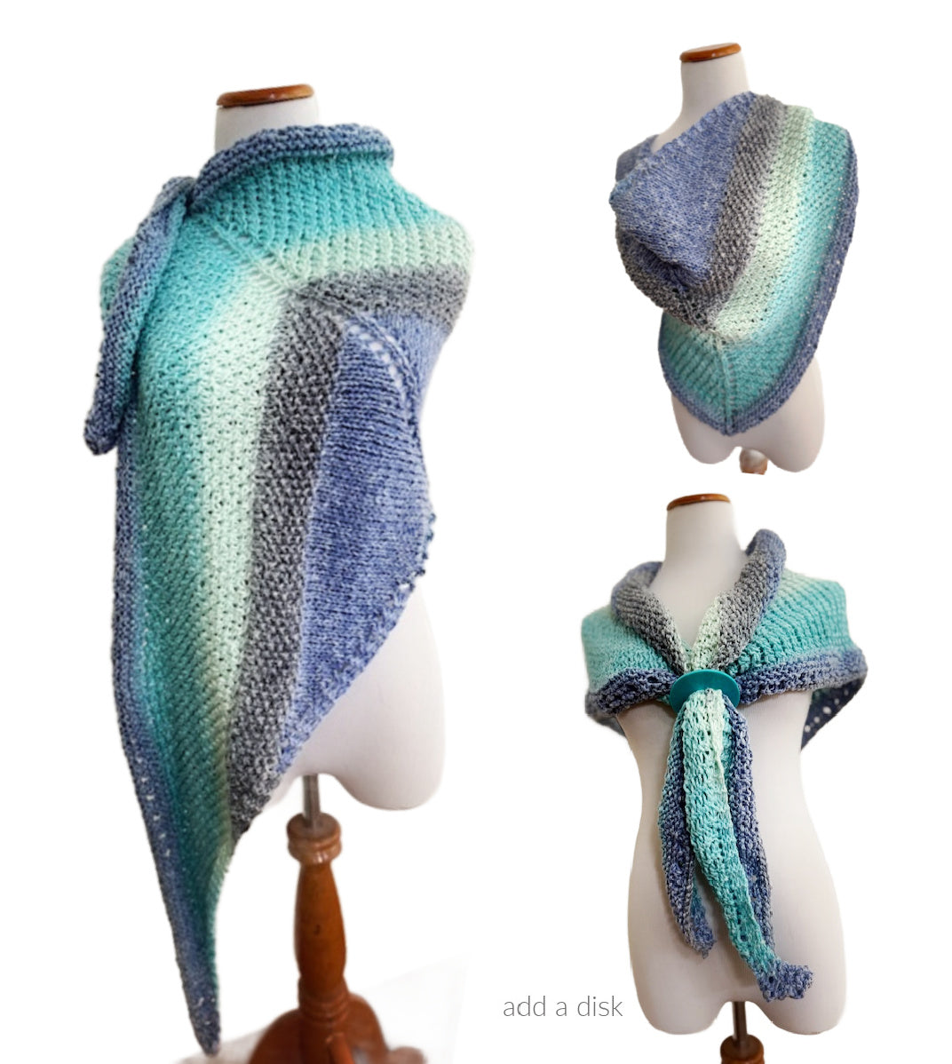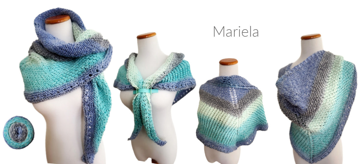 A triangle knit with pretty eyelets in the middle in one of the softest yarns in multiple pretty blue hues. The unblocked size measures 69” in length and 21” in middle height.