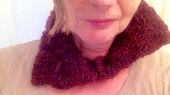 Mikado, a Tunisian crocheted neck warmer that almost appears to be industrial looking. It has a woven appearance and a rugged appeal when knitted in a thick and thin worsted weight harm.