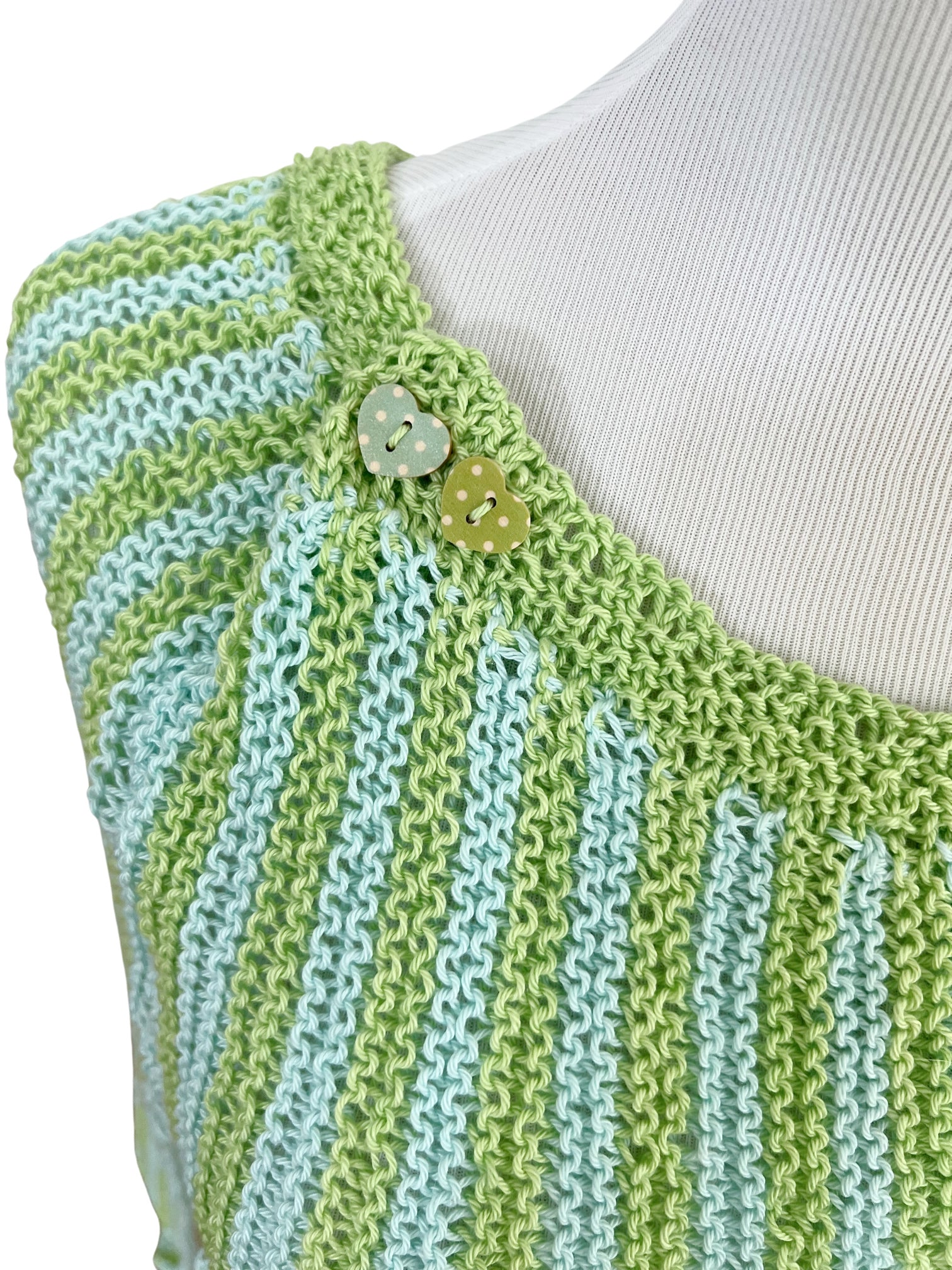 The Oodles of stripes poncho is knitted in a comfortable year around cotton yarn and in two lovely green tones.