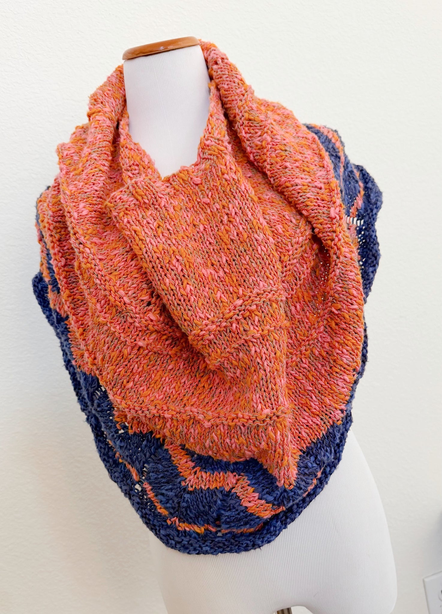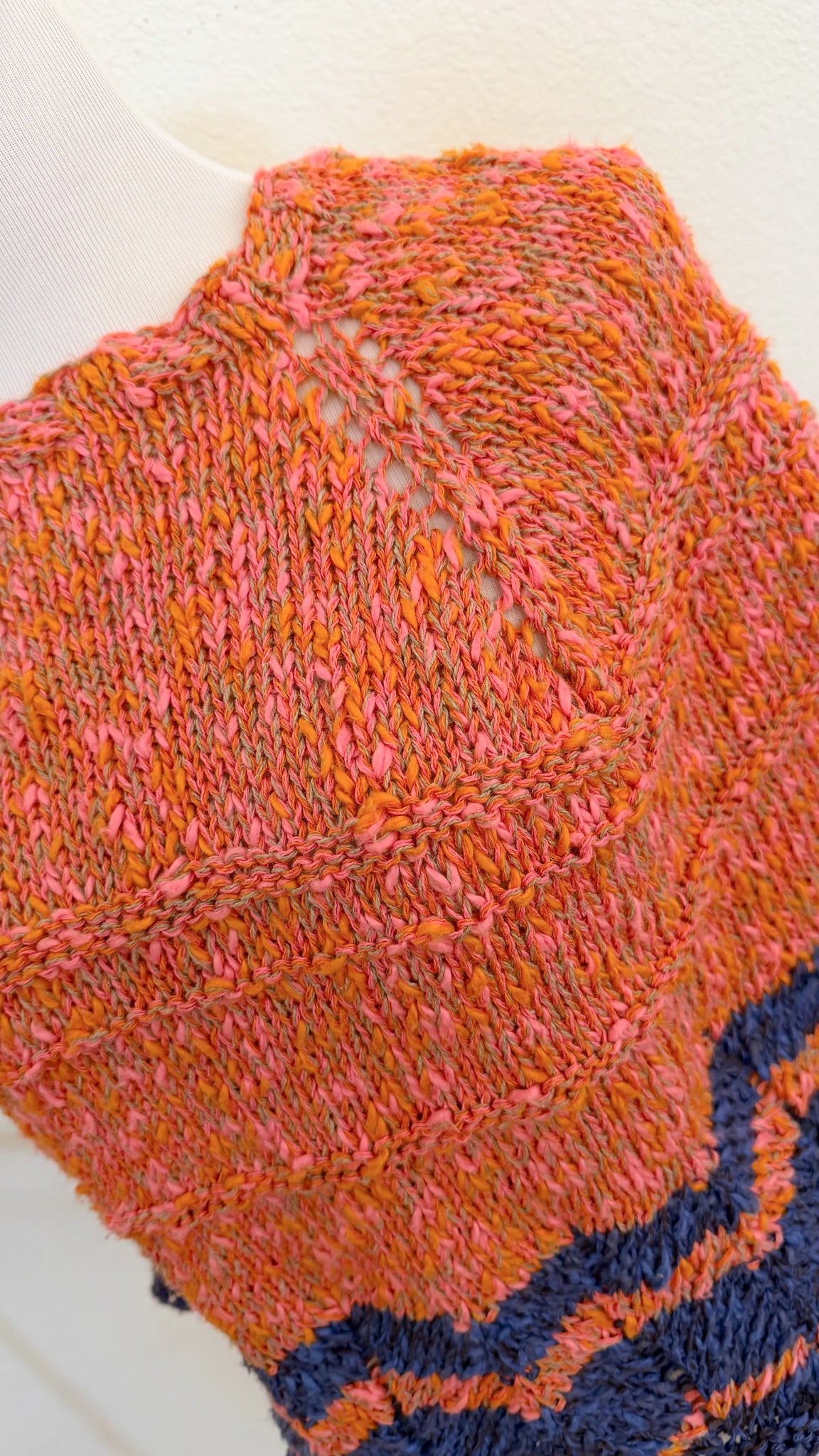 This colorful oversized poncho was created for the store and then some yarns became unavailable, so it never got added to the store. Knitted in raglan style from the top down with a contrasting lace border.