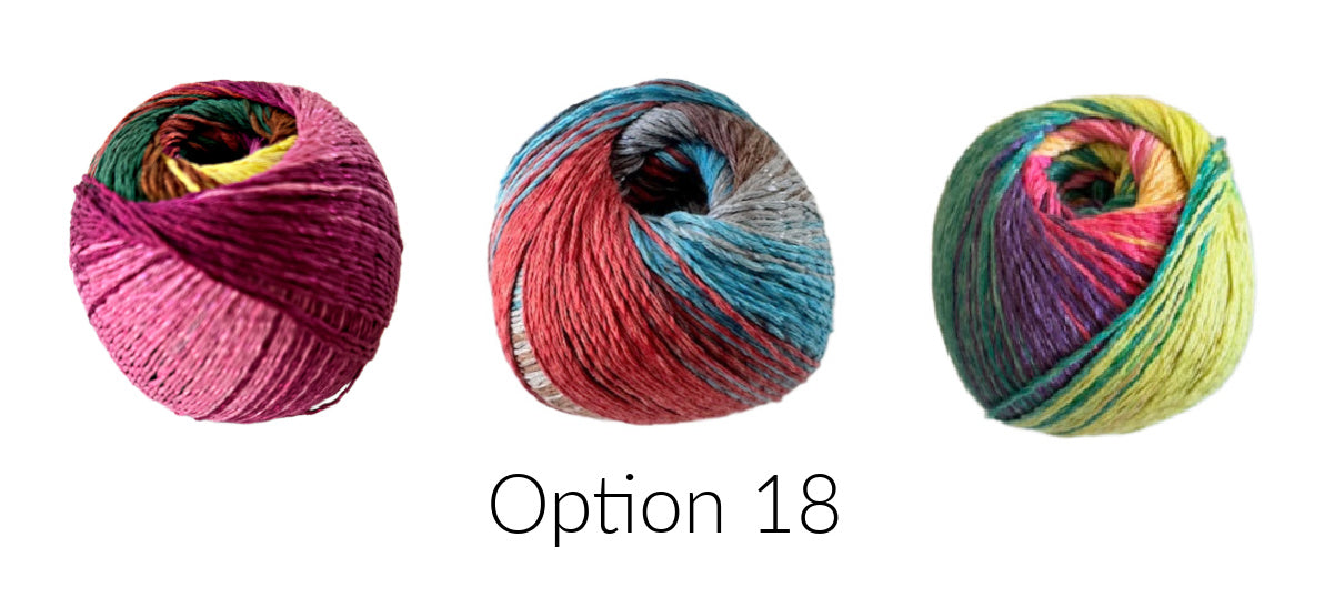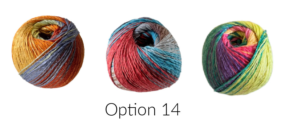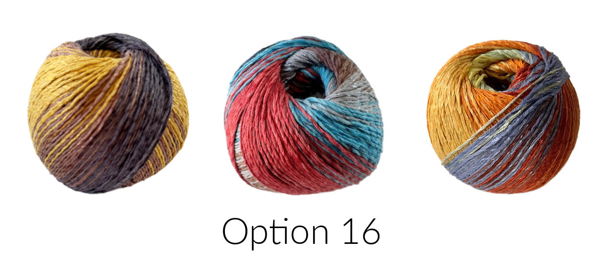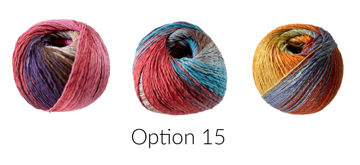- 3/6 skeins of Lustrous, a colorful self striping yarn with 380 yards/100 grams per skein in a blend of 70% cotton/30% viscose in a sport weight yarn. The vest is worked with all three yarns held together throughout.