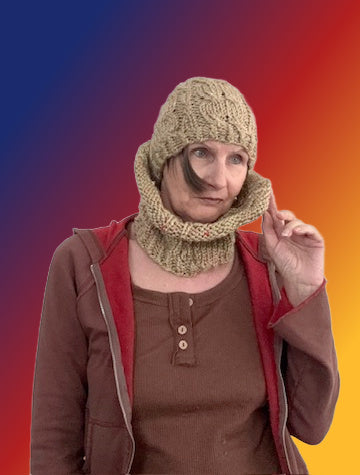 The all new Rikke cowl and matching hat or beanie if you like are both super quick and also colorful knits. Each one is created with just one of our new Spots cakes, a refreshingly soft and fluffy vegan yarn and it's washable. There are loads of little specks of colors and fibers added to each cake, adding a lively touch.