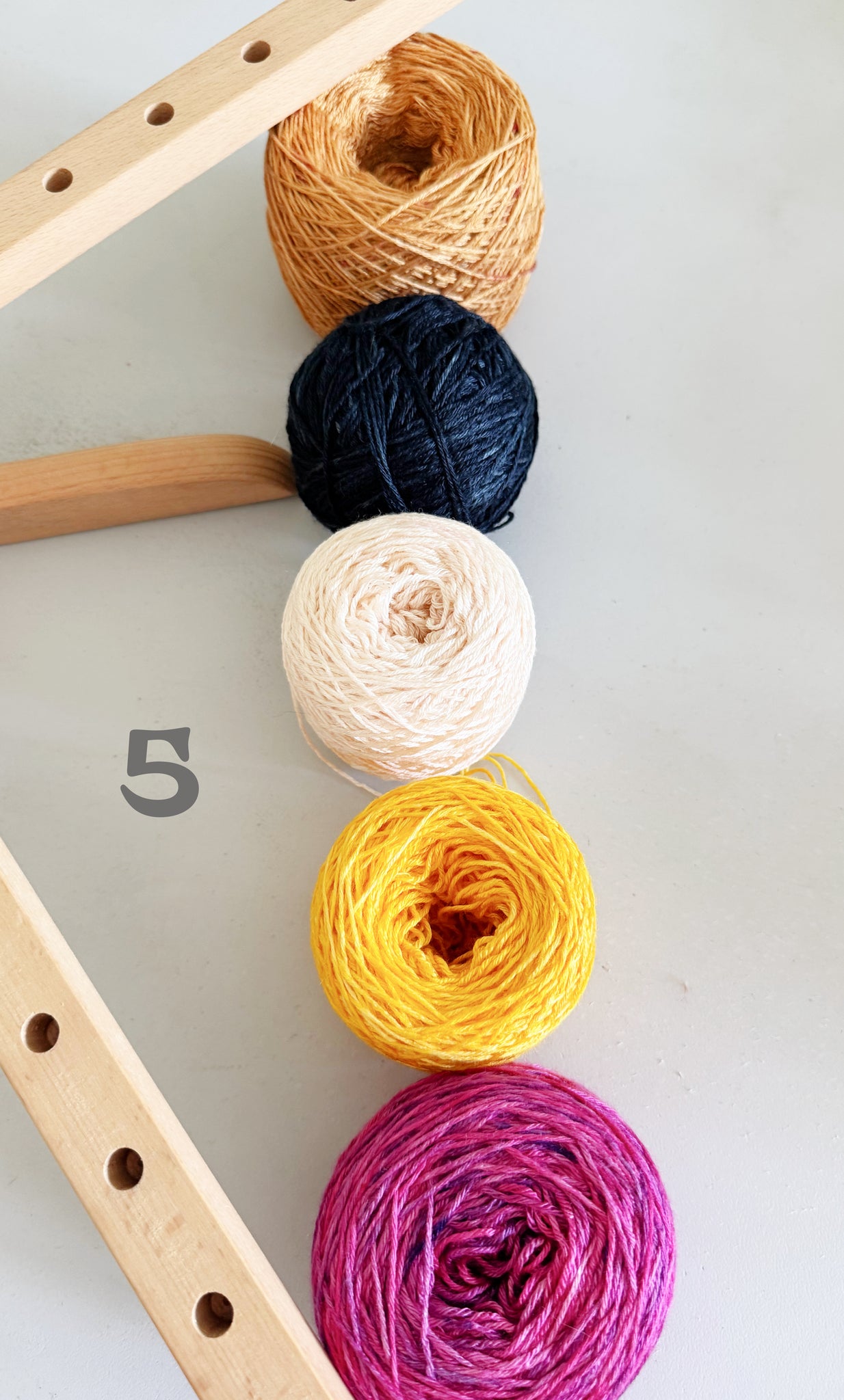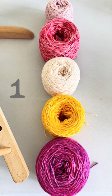 - A set of 5 mini skeins of fingering weight in hand dyed yarn, called Auxanometer by Theodora's Pearls. It's a luxurious Bamboo yarn and almost 300 yards of it, all perfectly portioned, so you don't have to buy 5 full skeins. Got to love that.