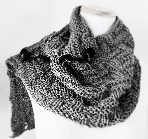 Beautifully textured and all buttons are fully functional in this wrap, which of course enables you to style your piece many ways. Simple knit and purl is what you do, so it is a wonderfully easy project. Though keep in mind it is a knitted maze, stay alert...