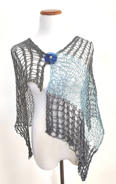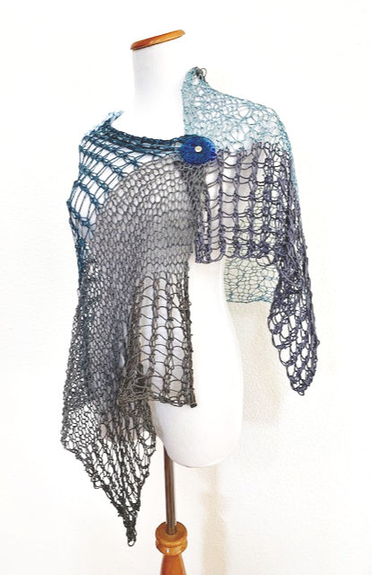The blocked shawl measures 54” in length and 19.5” in height. It can easily be made longer and wider, with more yardage added.