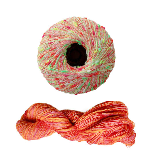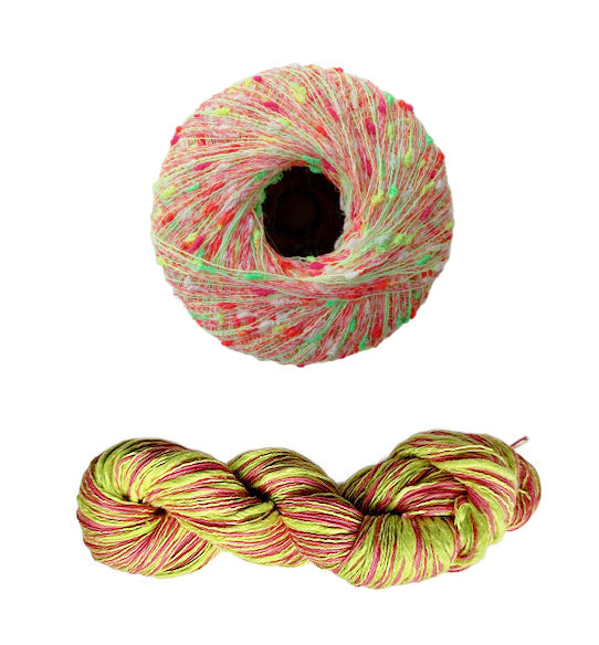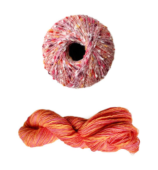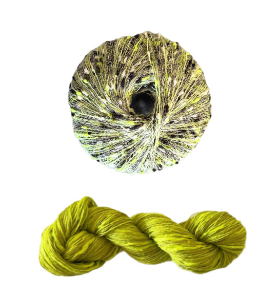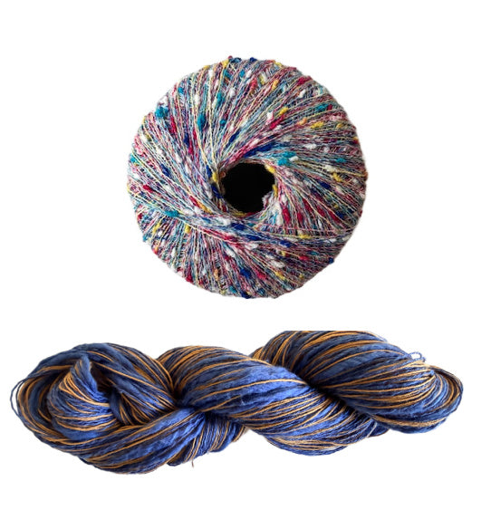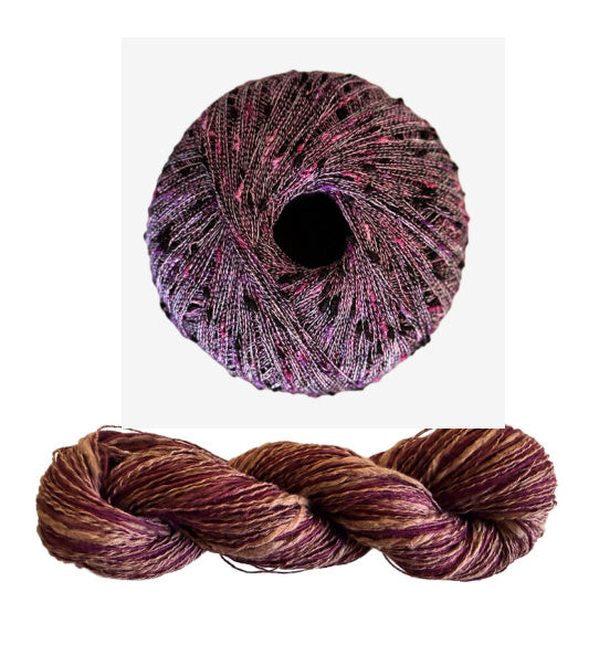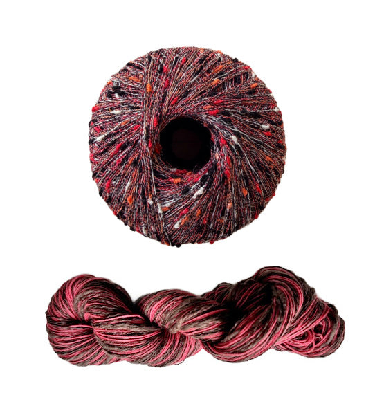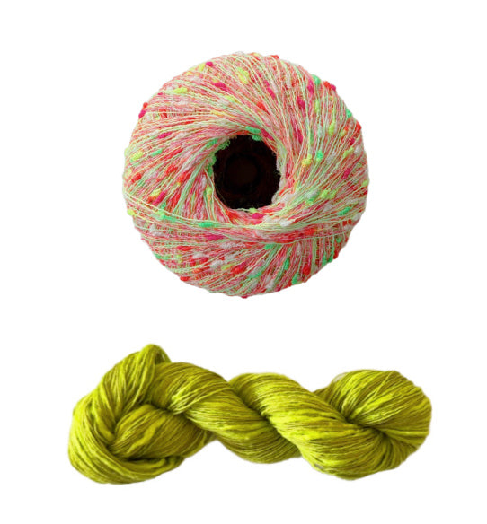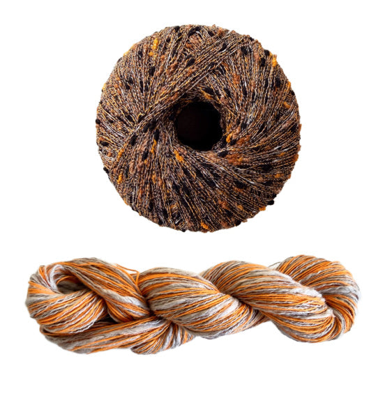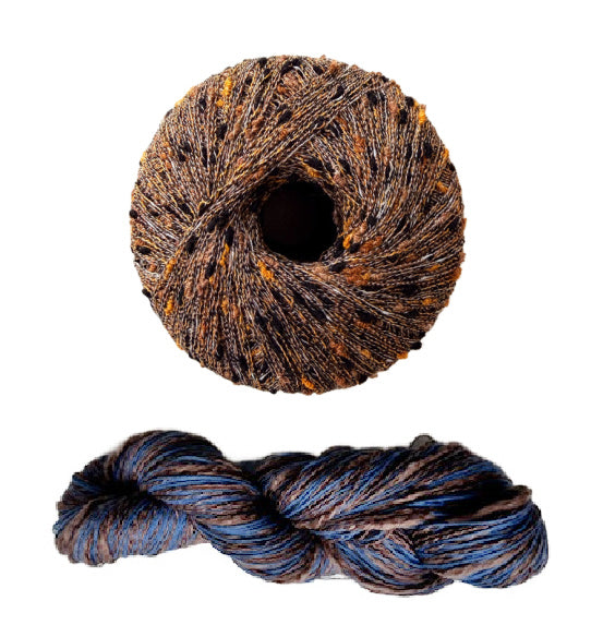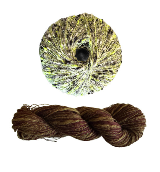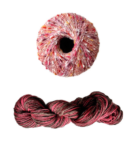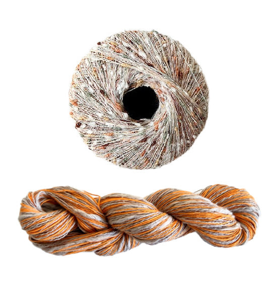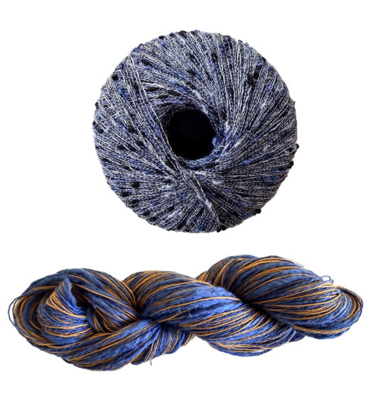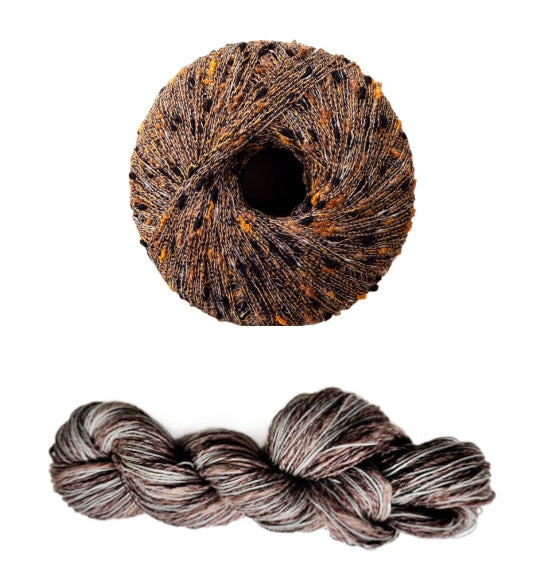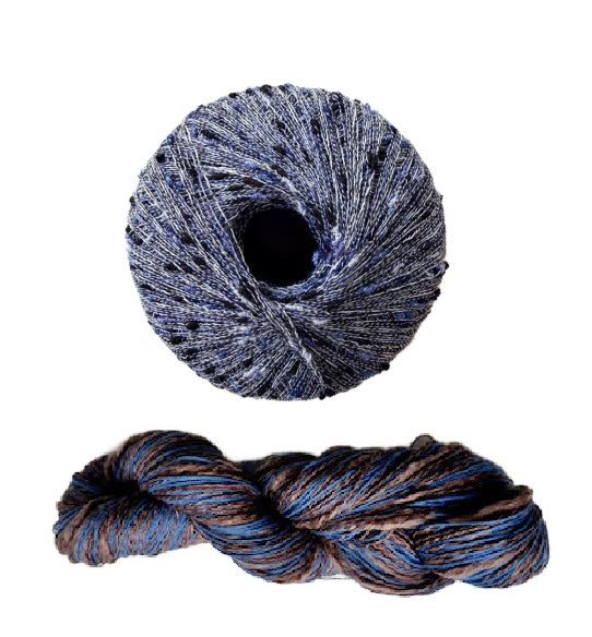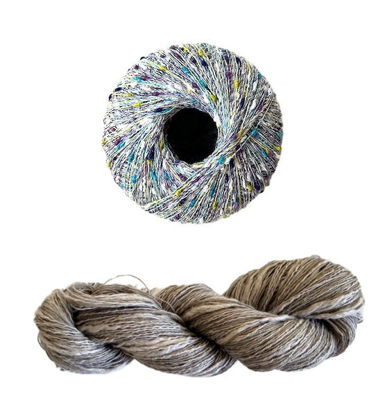 - Three Stipple skeins for all sizes, 120 yards each in a fingering weight. Two yarns wound together, a straight linen and a thick and thin cotton blend.