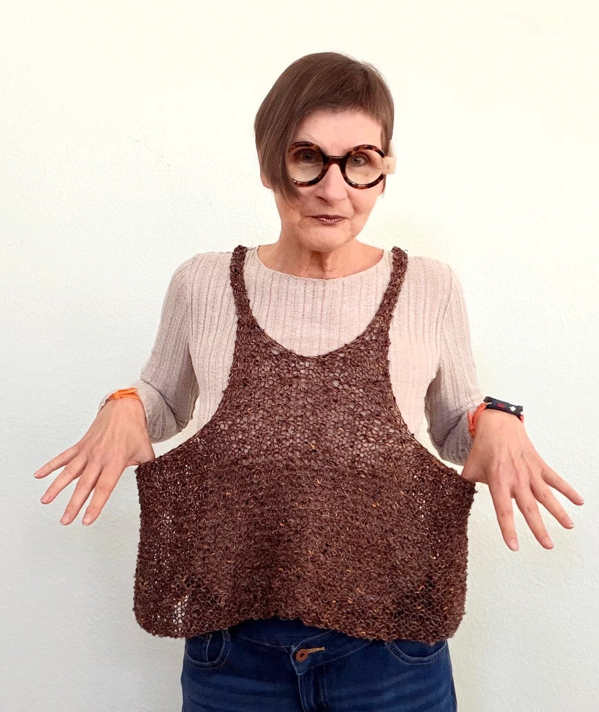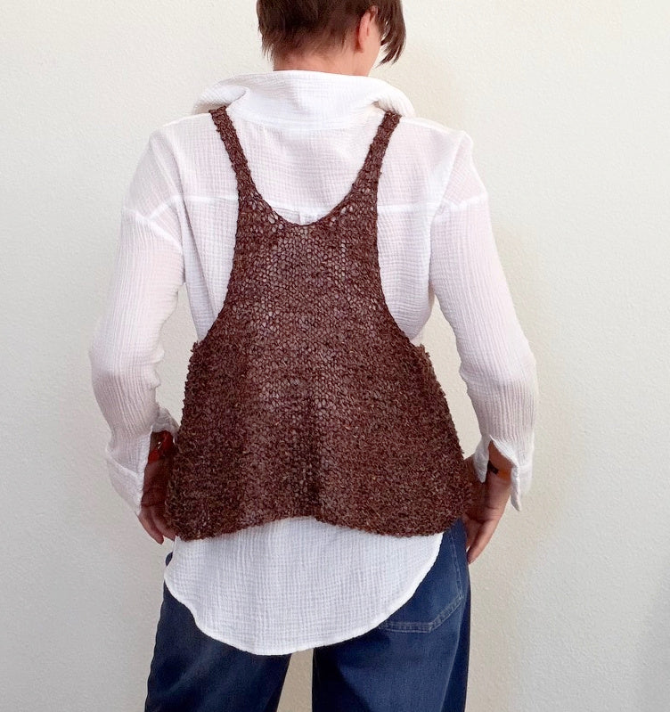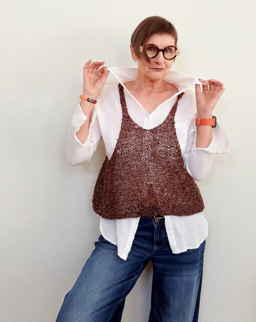Wear your Tankful over a fitted or loose hanging tee, a blouse, a sweater, even over a pretty dress. This tank is knitted with two distinct yarns to create the incredible textures and color plays. The fit is loose, it drapes beautifully, it moves with you whatever you are doing. So fun and also wonderfully casual.