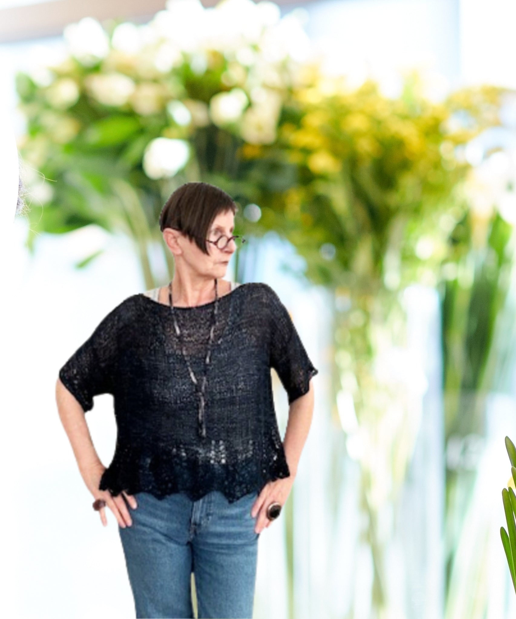 The light and airy “Topple sweater” with short sleeves and dropped shoulders as shown here is knitted flat and in the round. Of course you can add extra length in both the body and the sleeves as you like.